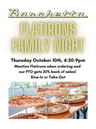 Dine-in or take-out, either way it’s an easy weeknight meal and way to benefit Flatirons! Join us at local restaurants who donate a portion of the evening’s sales directly back to Flatirons PTO. Dates TBD for 2024-2025 and will be posted in the Weekly Flyby.